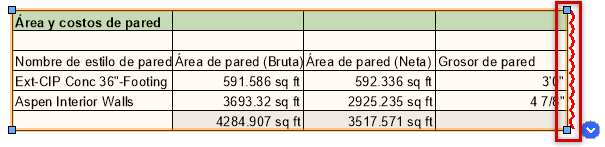 Seleccione la imagen de hoja de cálculo y mueva el cursor sobre el borde derecho o izquierdo del objeto para resaltarlo. Haga clic y arrastre para ver una vista previa del recorte, y luego haga clic nuevamente para aplicar el recorte. Columnas pueden ser recortadas desde uno o ambos costados de una imagen de hoja de cálculo, siempre que permanezca una columna. Un indicador vertical rojo que no se imprime se presenta para indicar el recorte. Cuando indicadores de recorte de columna se presentan puede ser controlado; consulte Preferencias de Vectorworks: Panel Hoja de cálculo.