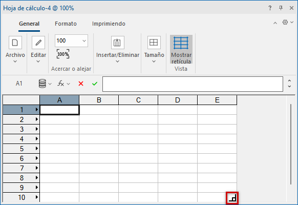 Desde la pestaña General filas pueden ser insertadas sobre o debajo de filas seleccionadas, o columnas pueden ser insertadas antes o después de columnas seleccionadas (consulte Hoja de cálculo: Pestaña General). Otra opción es posicionar el cursor en la esquina inferior derecha de la hoja de cálculo para activar un cursor de redimensionamiento especial; arrastre para agregar filas y columnas al costado inferior y derecho de la hoja de cálculo.