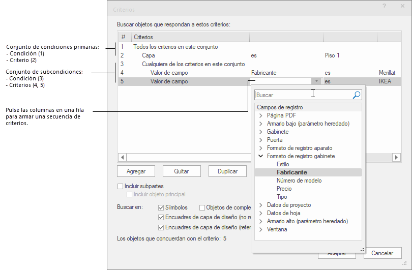 Para ser más específico, agregue un conjunto de condición (subcondición) anidado con sus propias declaraciones de criterios; por ejemplo, el objeto también tiene un Registro de gabinete adjuntado y el valor de campo Fabricante en el registro es Merillat o IKEA. Construya definiciones de criterios complejas con múltiples conjuntos de subcondiciones, si es necesario.