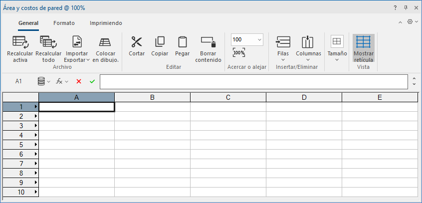 Se abre una ventana de hoja de cálculo en blanco. La barra de herramientas en la parte superior tiene tres pestañas: General, Formato e Imprimir. Debajo de la barra de herramientas está la barra de fórmula que será usada para definir los contenidos de las filas y columnas de la hoja de cálculo. Las filas y columnas están debajo de la barra de fórmula.