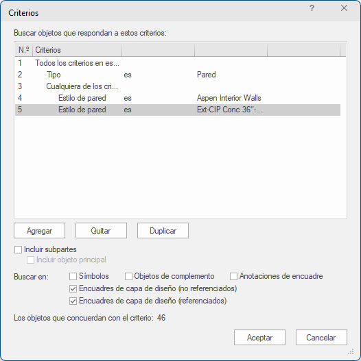 Si desea incluir todos los estilos de pared en el inventario debe parar aquí y no ingresar criterios para estilos de pared. Para este tutorial, debe incluir dos estilos de pared específicos y excluir todo otro estilo, lo cual requerirá más criterios.