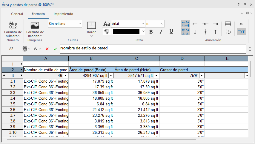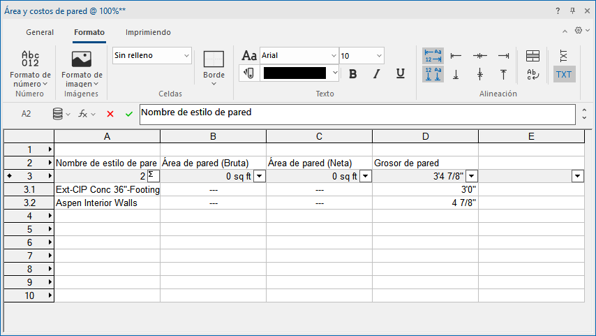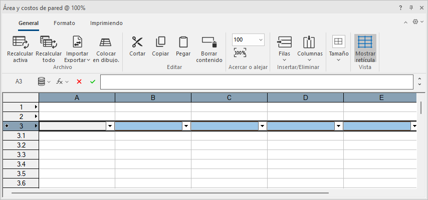 Haga clic en Aceptar para configurar los criterios. Se crea la base de datos de paredes para el conjunto especificado de estilos de paredes. El encabezado de base de datos (fila 3) ahora tiene un diamante junto al número de fila. Debajo de la fila 3 hay subfilas para cada objeto en la base de datos.