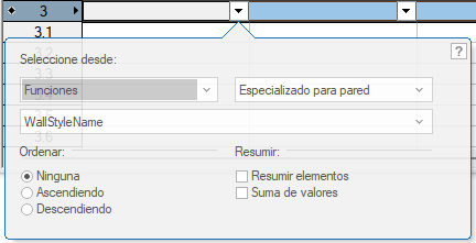 La celda de encabezado de base de datos para estilos de pared es celda A3. Haga clic en el botón de celda y haga clic en Resumir elementos. El número de subfilas es reducido a sólo dos (una fila por estilo de pared).