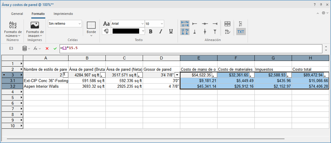 En E3 ingrese =C3*15.5 (multiplique el valor en C3 por 15.5, la tasa estimada de costo de mano de obra por unidad de área)